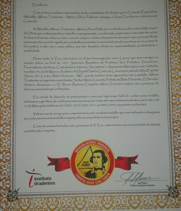 No site do Instituto Tiradentes (www.institutotiradentes.com), nossa equipe confirmou que a especialidade do Instituto é homenagear políticos por seu “desempenho”, mas não esclarece o método utilizado. A informação disponível no site diz que o “homenageado” precisa pagar uma taxa no valor de R$700,00 para receber o prêmio em Minas Gerais e que a taxa também dá direito a participar de um seminário. Segundo nossa fonte na câmara, os vereadores viajaram na manhã de quarta-feira, 23/08, com retorno previsto para o dia 25/08. Por conta desta “homenagem” os vereadores vão faltar três dias de trabalho e não vão participar da sessão da câmara desta quinta-feira, 24/08.