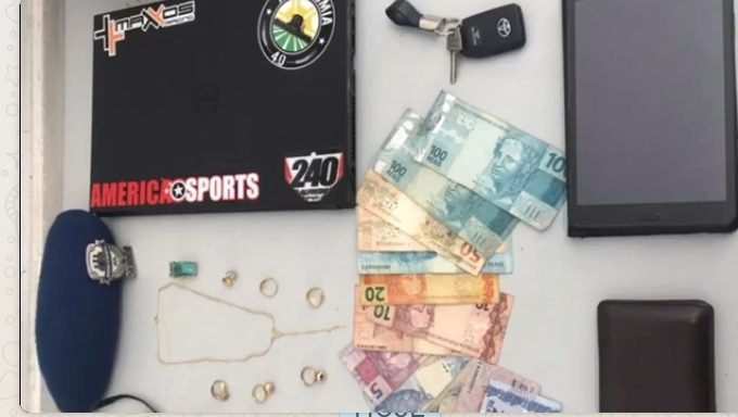 A equipe da Guarda percebeu que um indivíduo tentou fugir ao ver a viatura (prefixo GM 06). O homem foi abordado e com ele foi encontrada uma chave de um automóvel Toyota Hilux e uma mochila com diversos pertences. Na mochila foi encontrado um tablet, R$ 450 em dinheiro e diversas joias. Uma dessas joias era uma aliança de ouro com a inscrição de um nome.