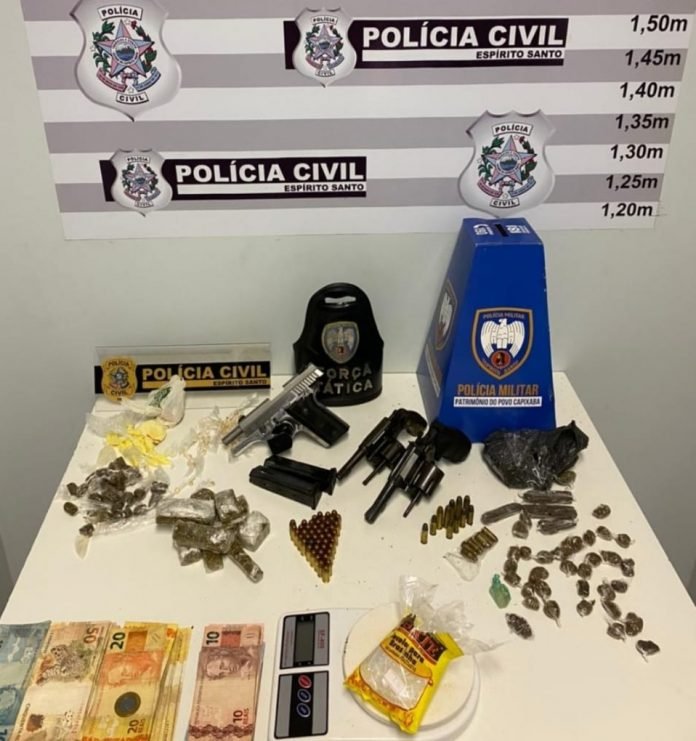 Foram cumpridos sete mandados de busca e apreensão domiciliares e foram empregados, aproximadamente, 45 policiais e 15 viaturas, além de uma cadela farejadora, que auxiliou os policiais na localização de objetos ilícitos. Foram apreendidos três armas de fogo, 65 munições, 67 pedras de crack pequenas e uma grande; 65 buchas; seis plantas e 318 gramas de maconha; 18 papelotes e 20 gramas de cocaína; R$ 2.561,00, em espécie; cinco celulares e material utilizado para pesagem e fracionamento de drogas.