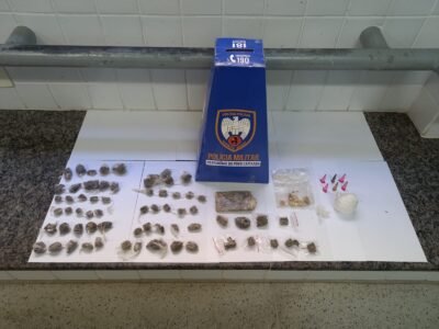 Já a tarde, durante patrulhamento no Bairro São Gabriel, com apoio da equipe do canil (K9), policiais militares realizaram buscas em um local conhecido e utilizado para tráfico de drogas e localizaram 64 buchas de maconha e 01 pedaço médio da mesma substância, 06 pinos, 01 papelote grande e 01 pequeno de cocaína e 07 pedras de crack. Diante dos fatos, o material apreendido foi entregue na 5ª Delegacia Regional de Guarapari. Não houve detidos.
