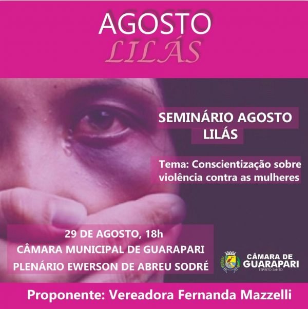 O Seminário Agosto Lilás que acontece quinta-feira (29/8), na Câmara Municipal de Guarapari vai debater o tema “Conscientização sobre violência contra as mulheres” e tem como objetivo mobilizar a opinião pública em torno da questão de violência praticada contra a mulher. O assunto vai ser conduzido pela doutora Francini Moresch, delegada titular da Delegacia Especializada em Atendimento à Mulher de Guarapari.